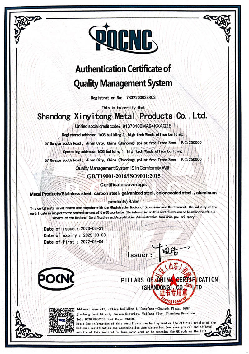 Xinyitong aims to become a world-class steel processing and sales enterprise, and uses its own integrity to forge an excellent company brand. The products have passed ISO9001 and other authoritative inspection certifications to ensure stable and reliable product quality.